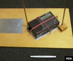 4.将收音机按照图上等样子平放在锡纸上,用两根橡皮筋十字交叉将收音机固定在板子上。这时,收音机的天线及第二支天线同时处于垂直三合板的位置。收音机的天线全部拉出,第二支天线的高度应稍低于收音机的天线。这样,系统就完成了。